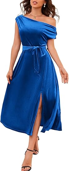 Women's Sleeveless One Shoulder Wrap Velvet Midi Dresses Cocktail Party Elegant Wedding Guest Dresses with Split