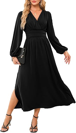 Womens Wrap V-Neck Empire Waist Dress Lantern Sleeve Ruched Side Slit Elegant Maxi Dress