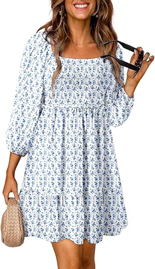 Womens Summer Fall Dresses Boho Floral Square Neck Smocked 3/4 Sleeve Casual A-Line Swing Mini Babydoll Dress