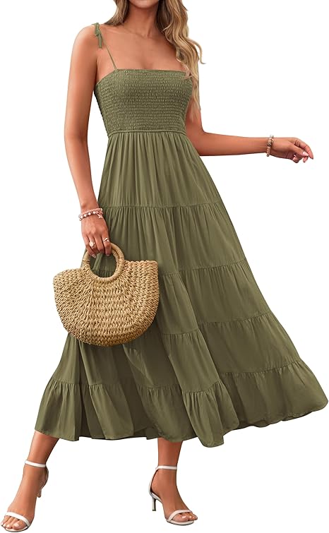 Women's Summer Dresses Spaghetti Strap Sleeveless Backless Smocked A-Line Boho Flowy Midi Beach Dress