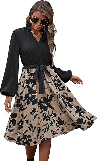 Women's Lantern Sleeve Floral Print V Neck Belted A Line Midi Flared Dress
